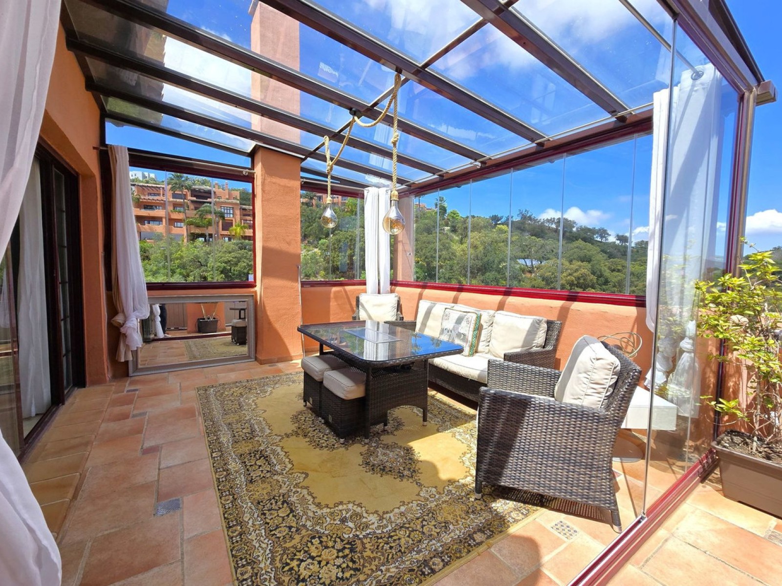 Le salon accueillant, doté d'une cheminée, s'ouvre sur une spacieuse terrasse vitrée qui offre des vues spectaculaires sur le golf et les montagnes de Mijas.